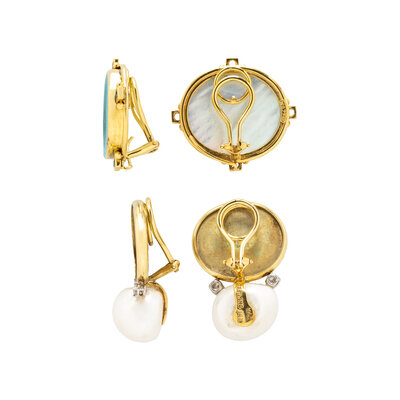 One pair set with round brilliant cut diamonds, and baroque cultured pearls, the other with blue glass intaglios backed with mother-of-pearl with square step cut blue stone accents. 14 karat yellow gold and sterling silver. Earrings: 1 1/4 x 11/16 inches. Intaglio earrings: 1 x 1 1/8 inches.