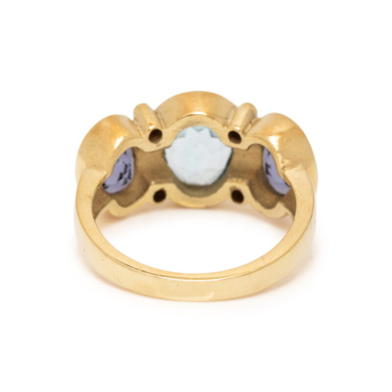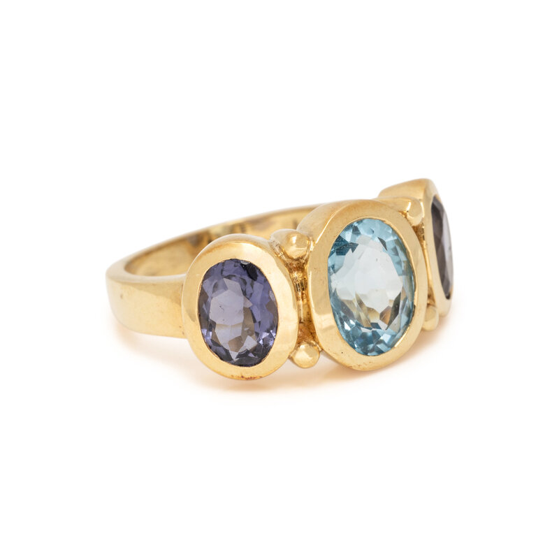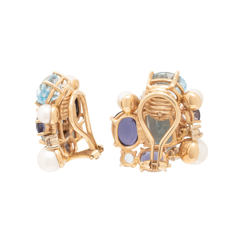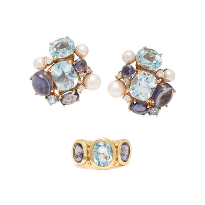 Consisting of a ring set with oval faceted blue topaz and iolite, together with clip earrings set with round brilliant cut diamonds, cushion, oval, and round faceted blue topaz, oval cabochon, oval, and round faceted iolite and cultured pearls. 14 karat yellow gold. Ring size: 6 1/4. Earclips: 1 inch long.