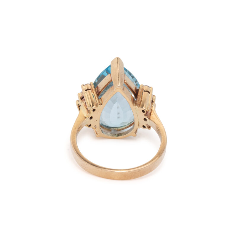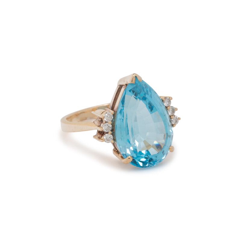 Pear shaped blue topaz measuring approximately 17.50 x 11.85 x 8.00 mm and round brilliant cut diamonds. 14 karat yellow gold. Ring size 6 3/4.