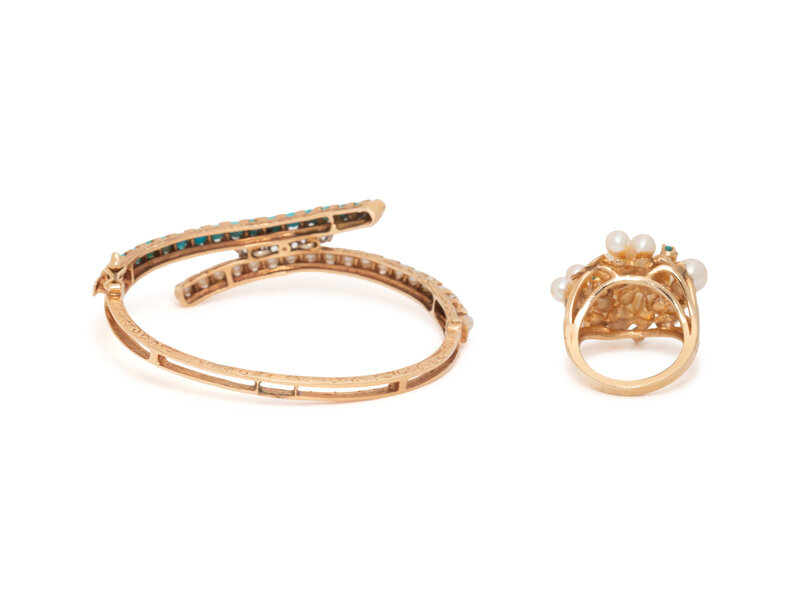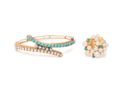 Consisting of a bangle bracelet, hinged with side clasp, set with single cut diamonds, seed pearls, and round cabochon turquoise, and a ring set with cultured pearls measuring approximately 4.00-6.00 mm and round cabochon turquoise. Bangle: 6 1/4 inches inner circumference. Ring size: 6.