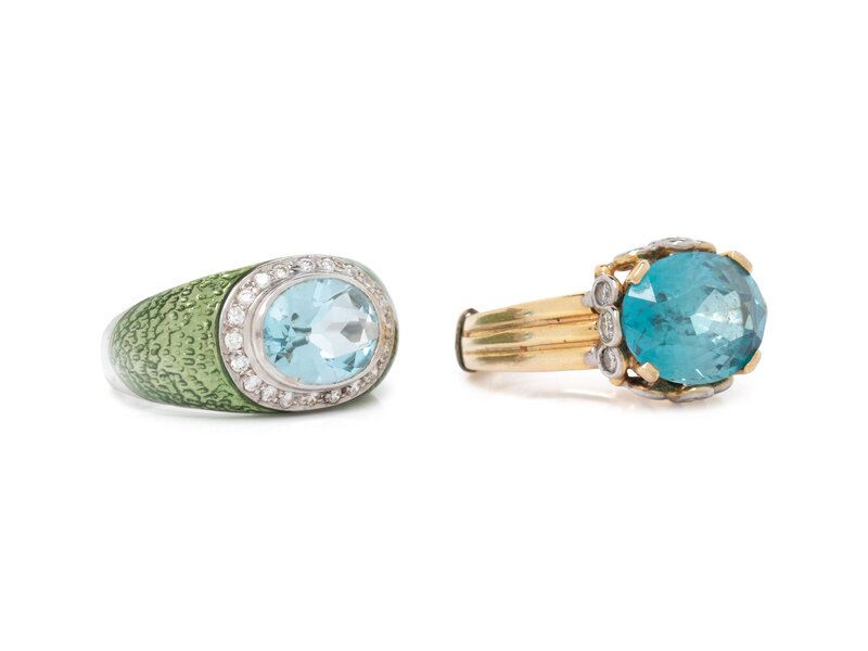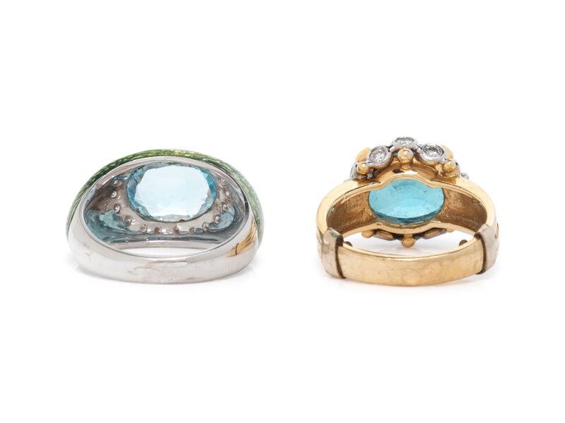Consisting of a yellow and white gold ring containing one oval faceted blue zircon measuring approximately 12.55 x 9.40 x 6.10 mm and round brilliant cut diamonds, together with a white gold ring containing one oval faceted blue topaz measuring approximately 10.00 x 7.80 x 4.70 mm, round brilliant cut diamonds, and green enamel. Ring sizes 6 1/2 and 6 1/2.