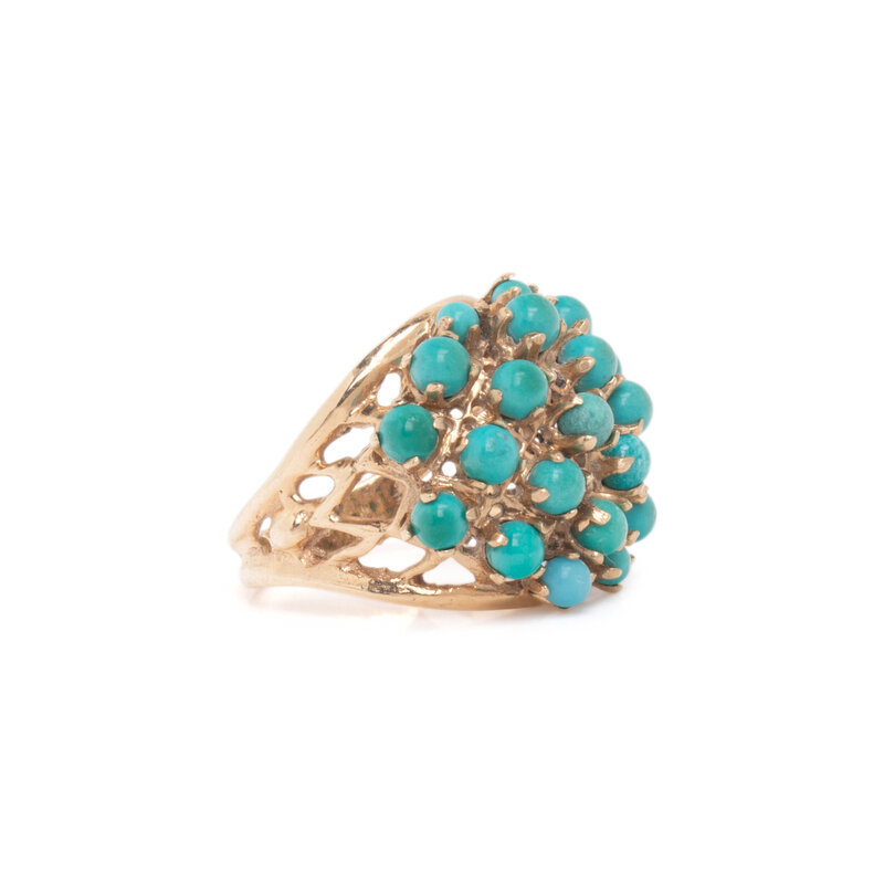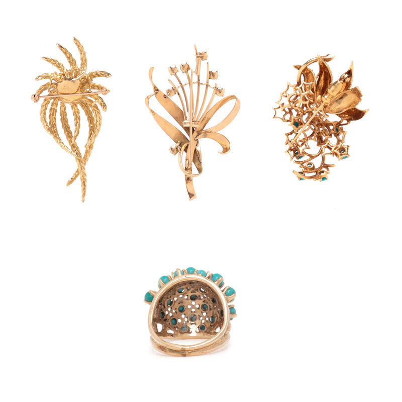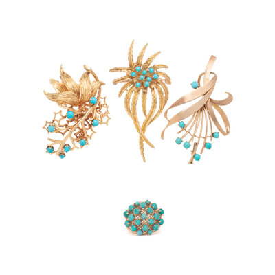 Consisting of three brooches and a ring, set with round cabochon turquoise. Yellow gold. Brooches: 2 inches long. Ring size 5 3/4.