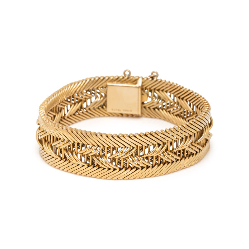 18 karat yellow gold. 7 inches long, 5/8 inch wide.
