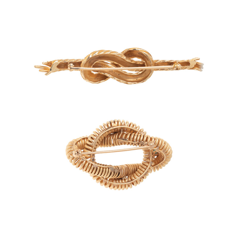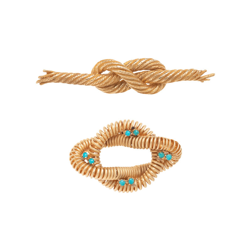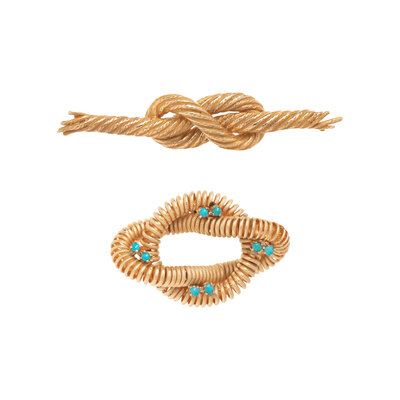 One set with round cabochon turquoise. Yellow gold. 2 1/2 inches x 1/2 inch, 1 3/4 inches x 1 inch.