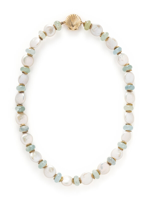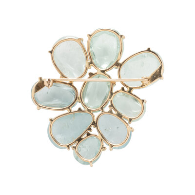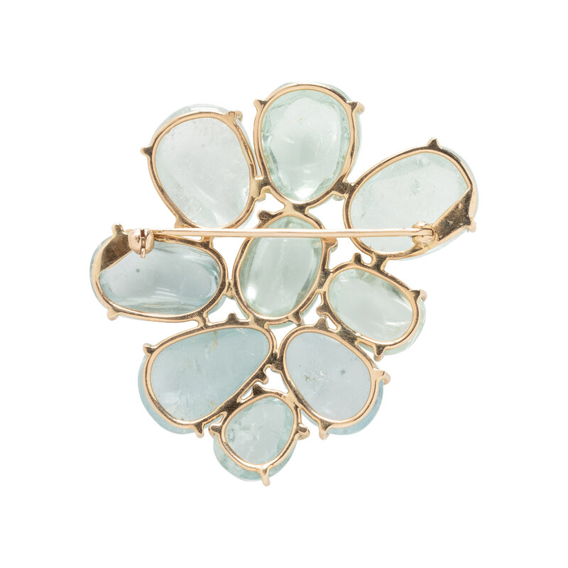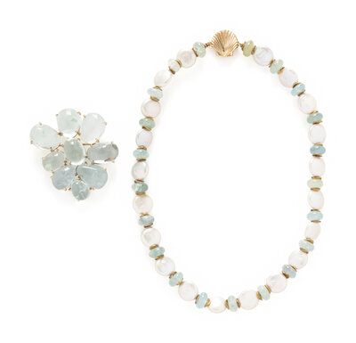 Including a necklace set with aquamarine beads measuring approximately 10.00 mm wide and cultured coin pearls measuring approximately 12.50 mm wide, and a brooch set with variously shaped cabochon aquamarine. Yellow gold. Necklace: 16 1/2 inches long. Brooch: 2 x 1 3/4 inches.