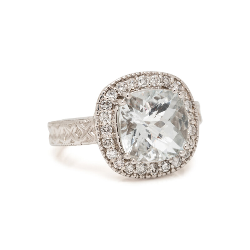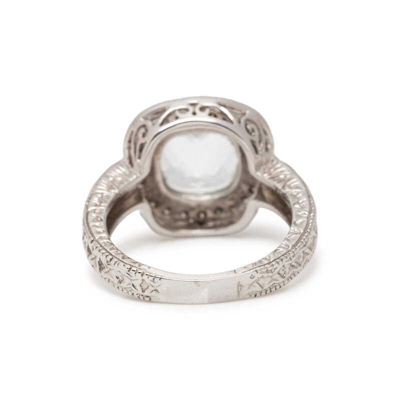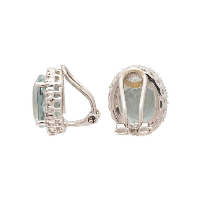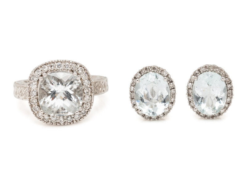 Ring set with a checkerboard cushion cut goshenite beryl measuring approximately 10.00 x 10.00 x 7.45 mm and round brilliant cut diamonds weighing approximately 0.35 carat total, and a pair of clip earrings set with oval faceted goshenite beryl measuring approximately 10.10 x 8.15 x 4.90 mm, and single cut diamonds weighing approximately 0.20 carat total. 14 karat white gold. Ring size: 7 1/4. Earrings: 1/2 inch long.