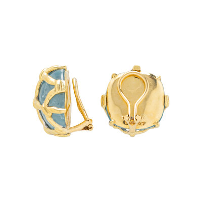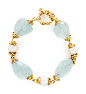 Including a bracelet set with asymmetrical faceted aquamarine beads and cultured pearls measuring approximately 9.85 - 10.25 mm, and a pair of clip earrings set with cabochon blue stones measuring approximately 18.30 x 18.30 x 9.40 mm. Yellow gold. Bracelet: 8 1/2. Earrings: 7/8 inch long.