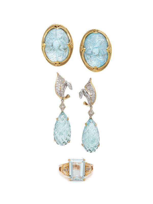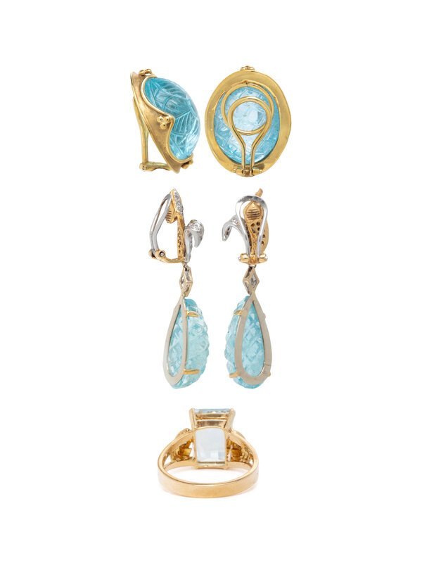 Including a pair of clip earrings set with carved blue topaz, a pair of clip earrings set with carved blue topaz and round brilliant cut diamonds, and a ring set with an emerald cut blue topaz and round brilliant cut diamond accents. Yellow gold. Topaz earrings: 1 inch long. Topaz and diamond earrings: 1 3/4 inches long. Ring size: 7.