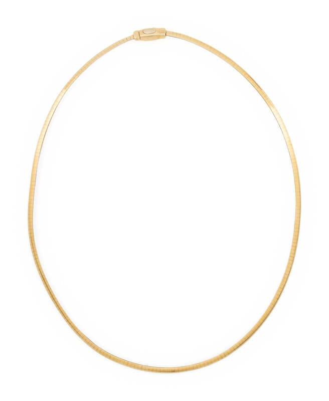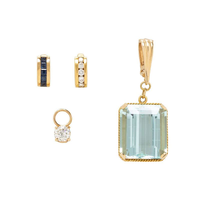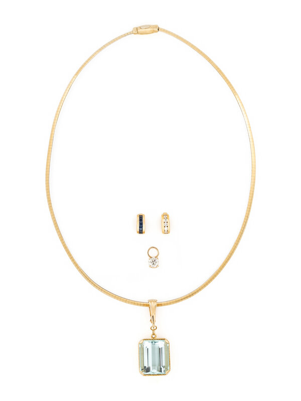 Including a reversible omega necklace, a pendant set with an emerald cut aquamarine, a solitaire round brilliant cut diamond charm, a slider charm set with round brilliant cut diamonds, and a slider charm set with square step cut sapphires. Yellow and white gold. Necklace: 16 1/4 inches long. Pendants: 1 1/2 inches long. Solitaire charm: 1/2 inch long. Slider charms: 3/8 inch long.