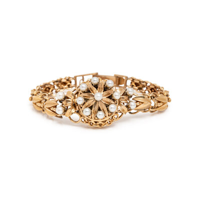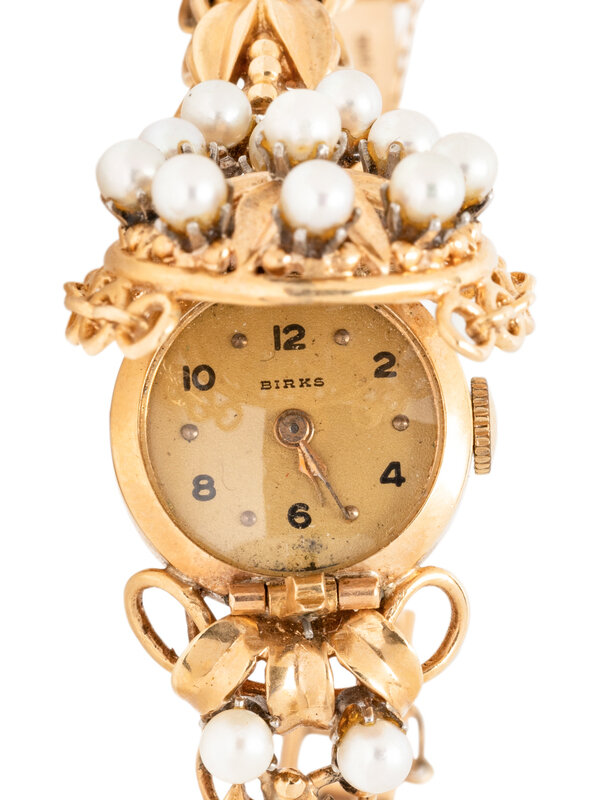 BIRKS, YELLOW GOLD AND CULTURED PEARL SURPRISE WATCH