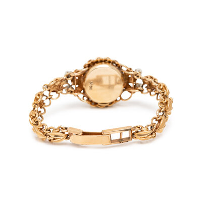 Stamps: Case back: 14K. Clasp: 14K BIRK.