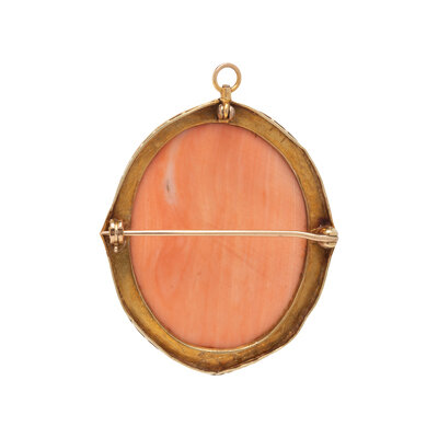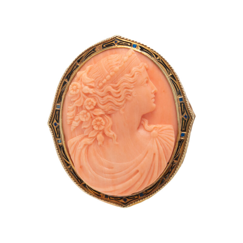Coral cameo measuring approximately 39.00 x 30.00 mm, black and blue enamel. Yellow gold. 1 3/4 x 1 1/2 inches.