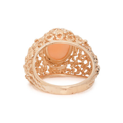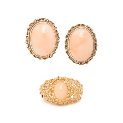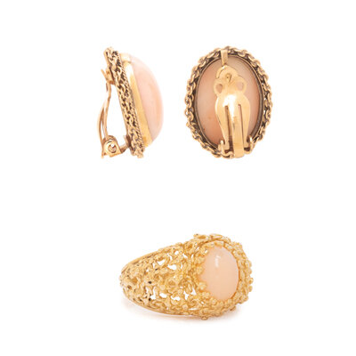 Oval cabochon angel skin coral measuring approximately 10.00 x 7.50 and 17.50 x 13.00 mm. Yellow gold. Ring size: 6 3/4. Earclips: 7/8 inch long.