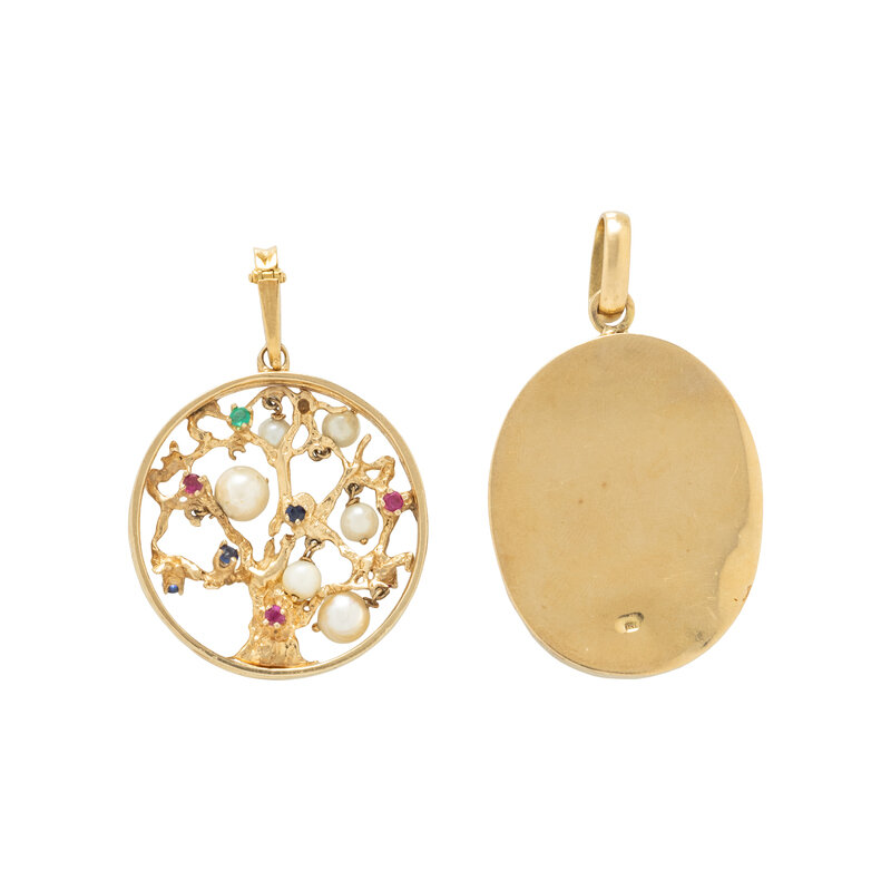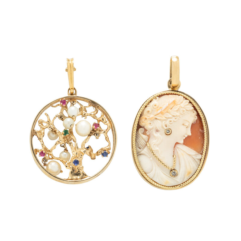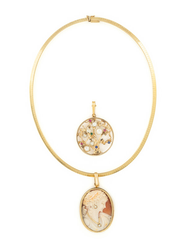 Including an omega necklace, a cameo pendant with round brilliant cut diamond accents, and a tree pendant set with cultured pearls and round faceted synthetic ruby, chrysoprase, and synthetic sapphire accents. Yellow gold. Necklace: 15 3/4 inches long. Cameo pendant: 2 1/8 inches long. Tree pendant: 2 inches long.