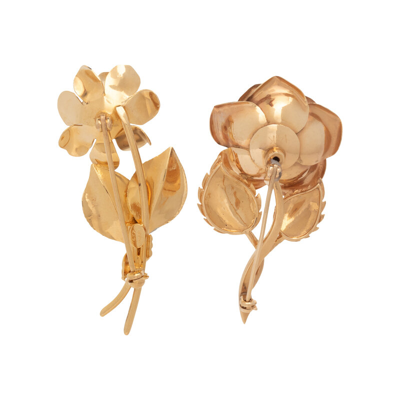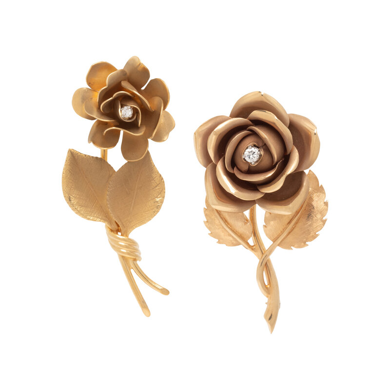 PAIR OF BICOLOR GOLD AND DIAMOND ROSE BROOCHES