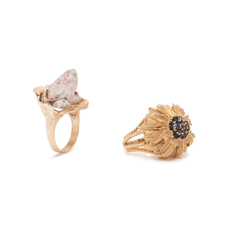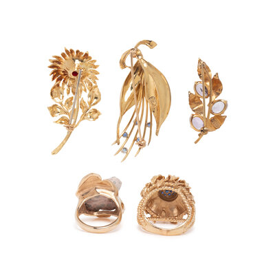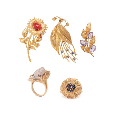 Including a ring set with a carved frog, a ring set with round faceted sapphires, a brooch set with oval faceted amethyst, a brooch set with an oval cabochon coral, and a brooch set with round faceted sapphires. Yellow gold and gold filled. Ring sizes: 5 1/2 and 7 1/4. Brooches: 1 1/2 x 5/8 inches, 1 7/8 x 7/8 inches, and 2 1/8 x 7/8 inches.