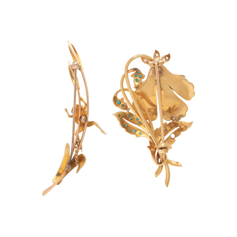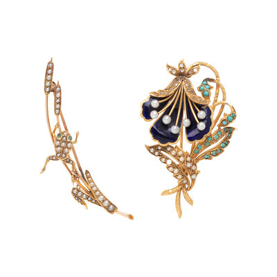 Consisting of a floral motif brooch with blue enamel, rose cut diamonds, round cabochon turquoise, seed pearls and half pearls, together with a cattail and frog brooch set with half pearls and two emerald eyes. Yellow gold. 2 1/4 x 1 1/2 inches, 2 1/2 inches x 1/2 inch.