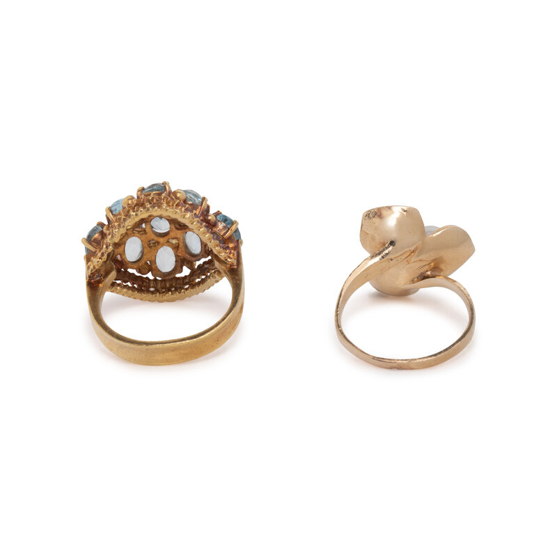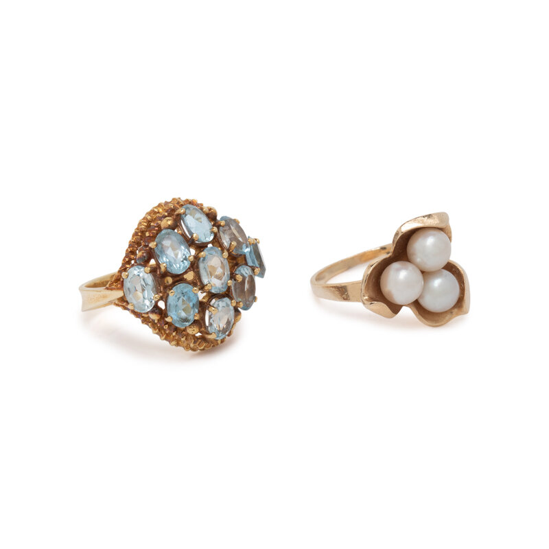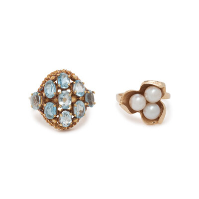 One set with cultured pearls, the other with oval faceted blue topaz. 14 karat and 18 karat gold. Ring sizes 6 1/2 and 6 3/4.