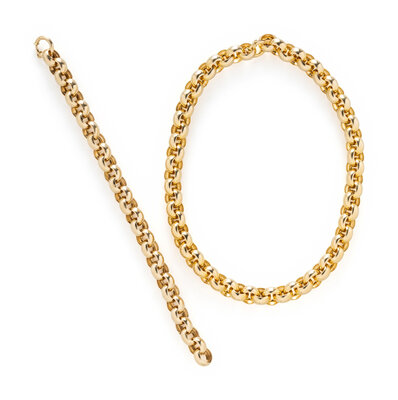 Consisting of a necklace and bracelet, able to be clasped together. 14 karat yellow gold. Necklace: 15 inches inner circumference. Bracelet: 7 inches inner circumference.