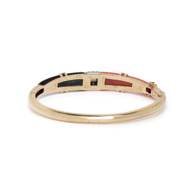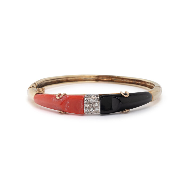 Coral, onyx, and single cut diamonds, hinged with side clasp. 14 karat yellow and white gold. 6 1/8 inches inner circumference.