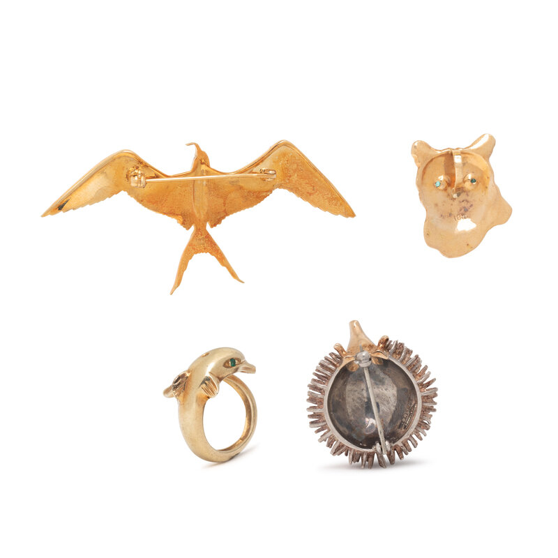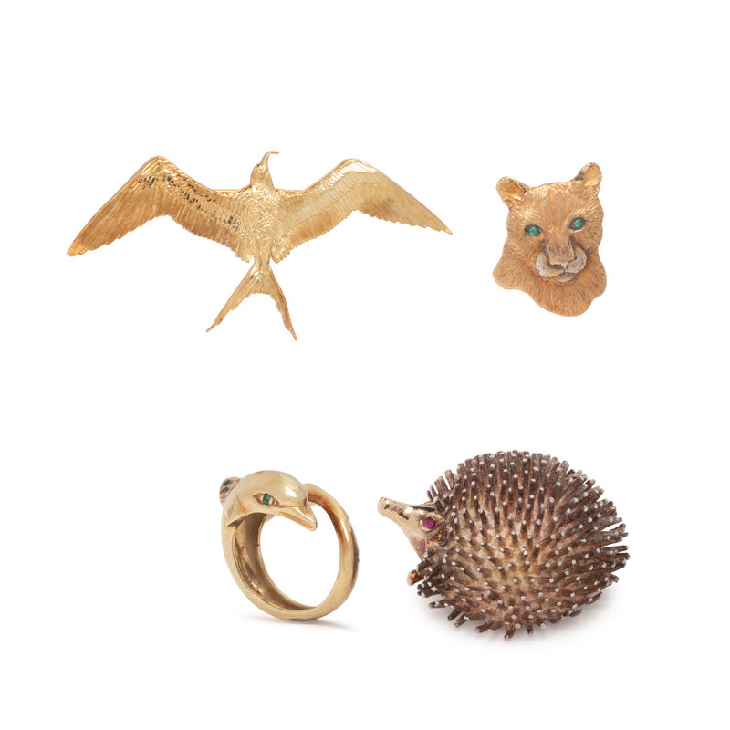 Consisting of a yellow gold bird brooch, panther pendant with emerald eyes, dolphin ring with emerald eyes, and a silver and yellow gold hedgehog brooch with ruby eyes. Bird: 2 1/2 x 1 1/4 inches. Panther: 1 x 3/4 inch. Ring size: 4. Hedgehog: 1 inch wide.