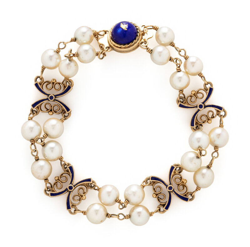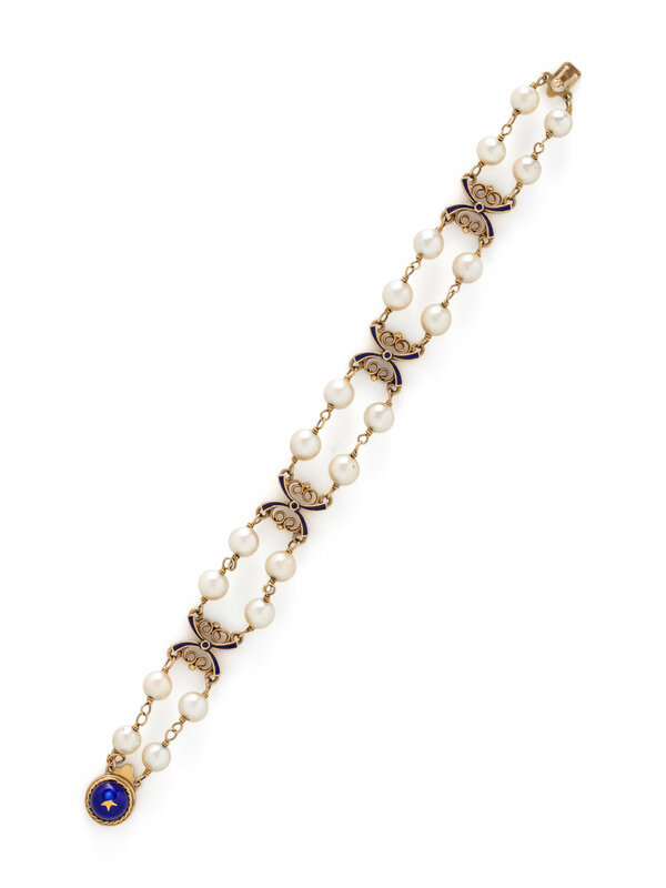 YELLOW GOLD, CULTURED PEARL, AND ENAMEL BRACELET