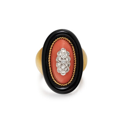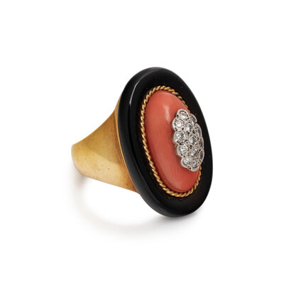 DIAMOND, CORAL, AND ONYX RING