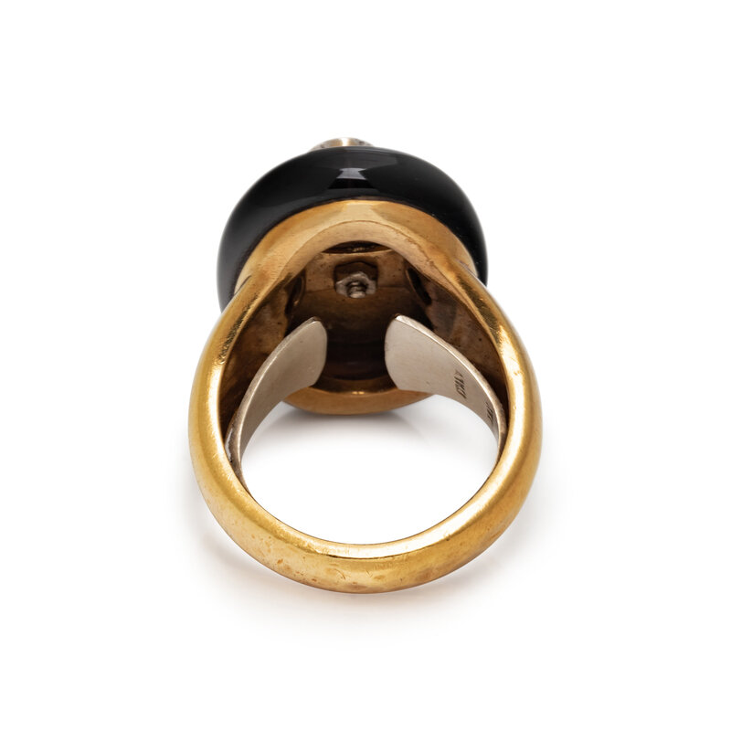 Round brilliant cut diamonds, oval cabochon coral, and carved onyx. 18 karat yellow gold. Ring size 7 3/4.