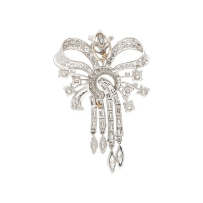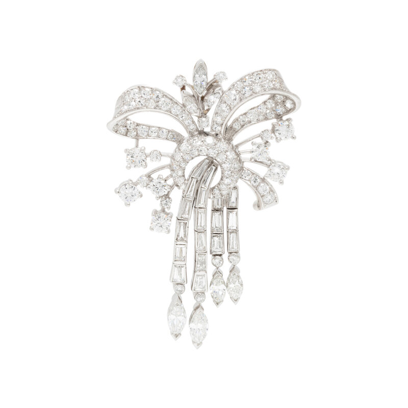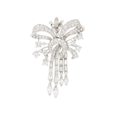 Round brilliant, single, marquise, and baguette cut diamonds weighing approximately 5.00 carats total. Platinum. 2 1/8 x 1 3/8 inches.