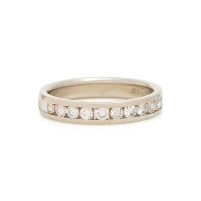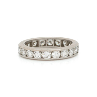 Ring set with 11 round brilliant cut diamonds weighing approximately 0.55 carat total, and an eternity band set with round brilliant cut diamonds weighing approximately 2.00 carats total. White gold and platinum. Ring sizes 7 1/4 and 6.