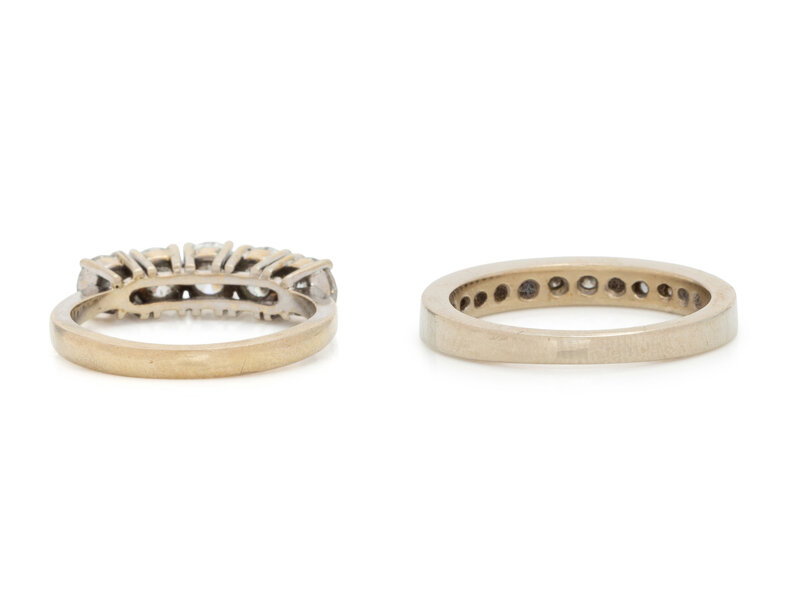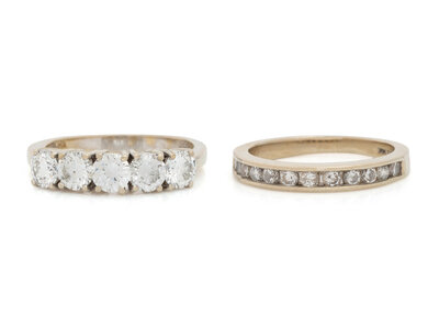 Including a ring set with five round brilliant cut diamonds weighing approximately 1.30 carats total, and a band channel set with round brilliant cut diamonds weighing approximately 0.50 carat total. 18 karat and 14 karat white gold. Ring sizes 5 3/4 and 7.