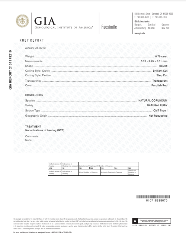 GIA, 2013, Report No. 2151179219, Natural Corundum, Ruby, Geographic origin non tested, no indications of heating.