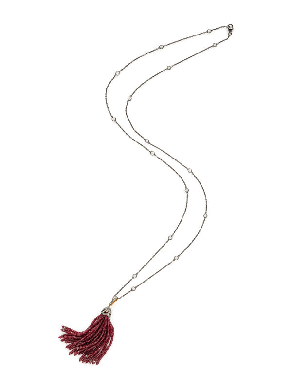 DIAMOND, ROCK CRYSTAL, AND RUBY TASSEL NECKLACE