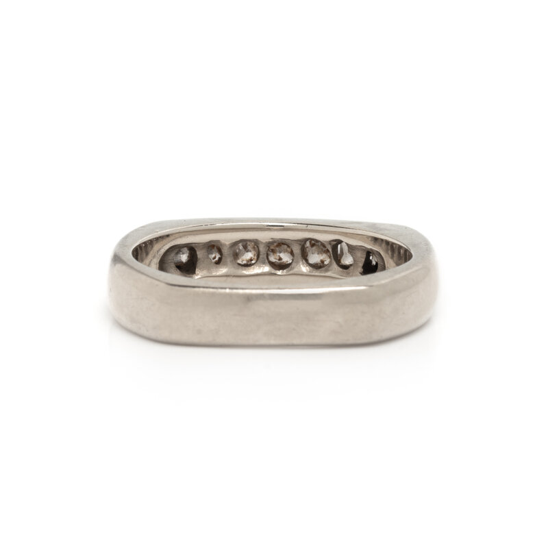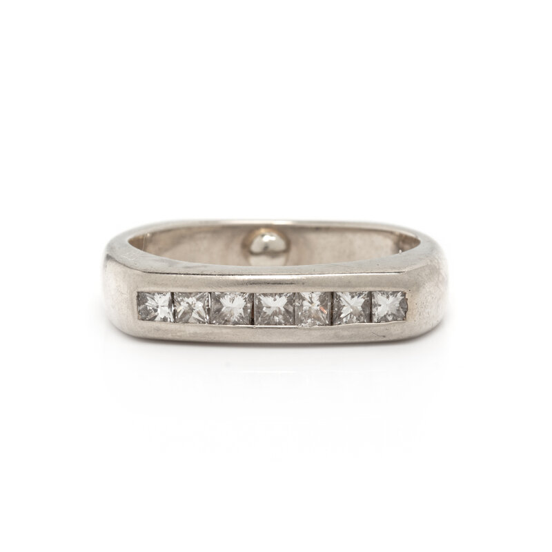 Princess cut diamonds weighing approximately 0.60 carat total. 14 karat white gold. Ring size 9.