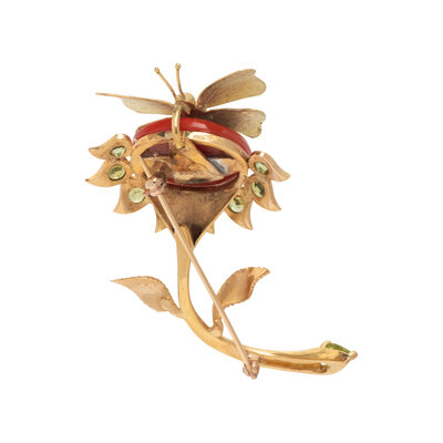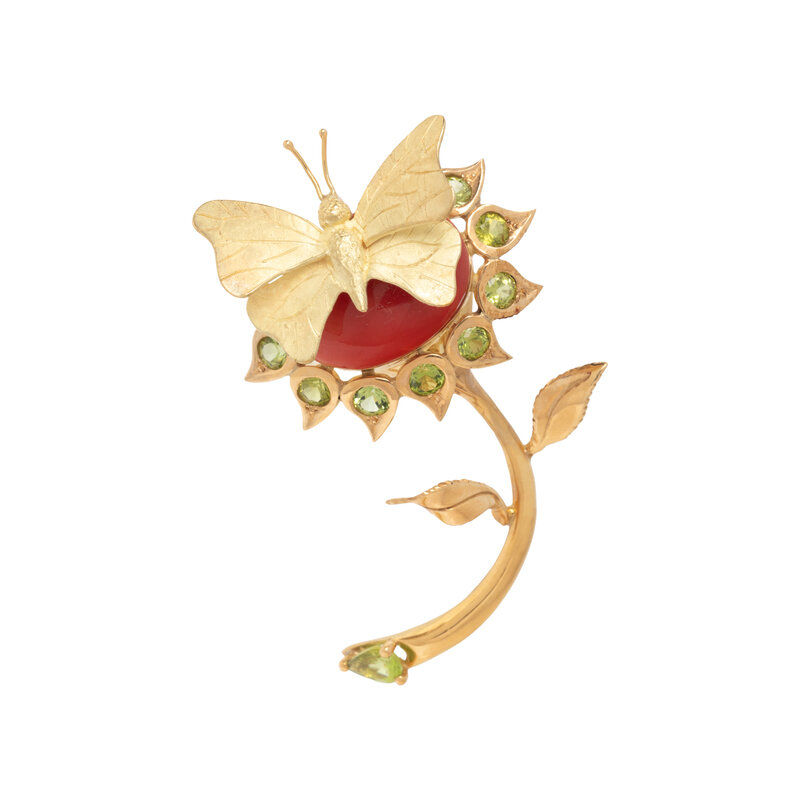 CORAL, PERIDOT, AND YELLOW GOLD FLOWER BROOCH