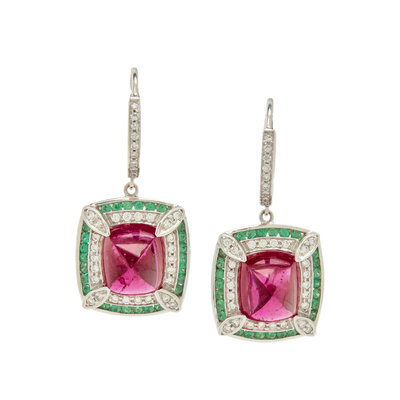 Two sugarloaf tourmalines measuring approximately 9.15 x 8.05 x 5.50 mm, round brilliant cut diamonds weighing approximately 0.36 carat total and round cut tsavorite garnets. 18 karat white gold. 1 1/4 inches long.