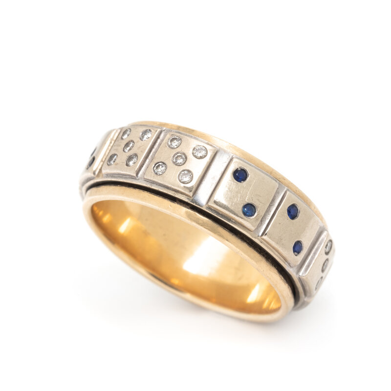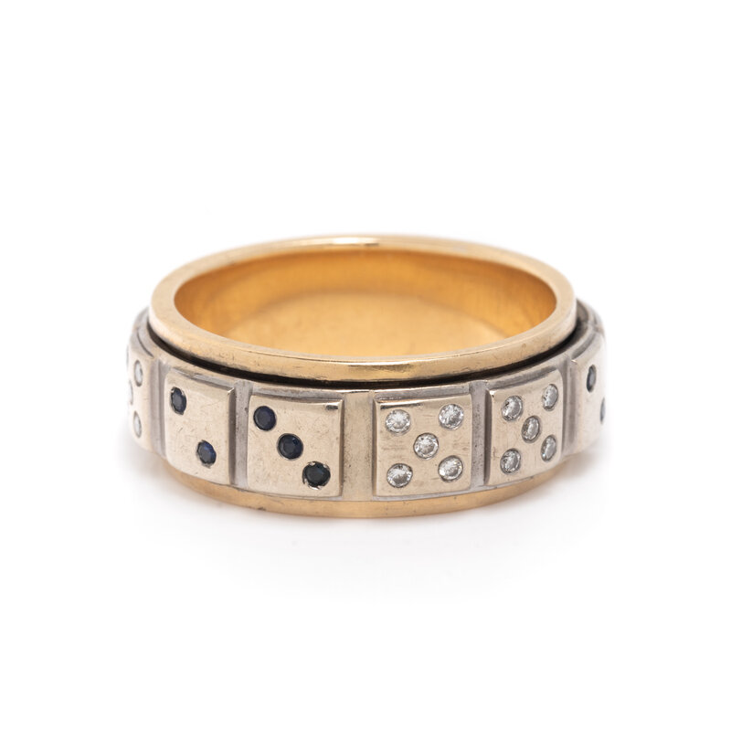 Round brilliant cut diamonds and round faceted sapphires. Yellow and white gold. Ring size 10 1/2.