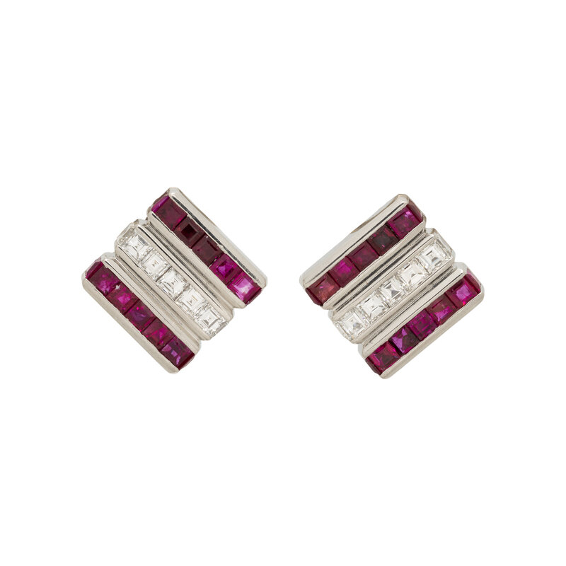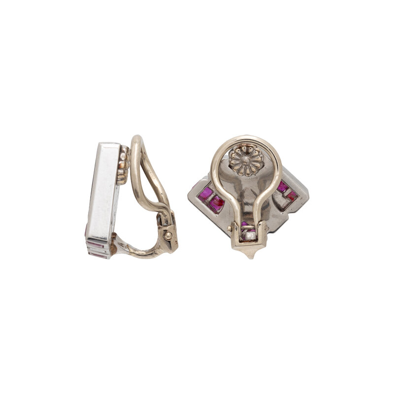 Square faceted rubies and carre cut diamonds. White gold. 1/2 x 1/2 inch.