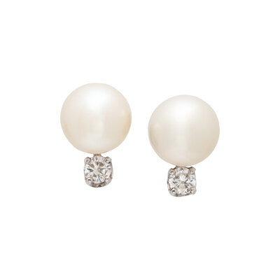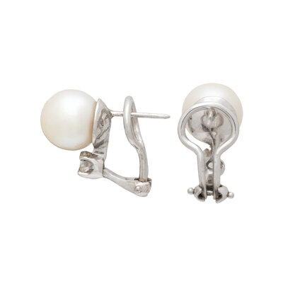 Cultured pearls measuring approximately 8.90 mm each, and round brilliant cut diamond accents. 14 karat white gold. 5/8 inch long.