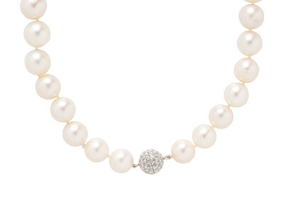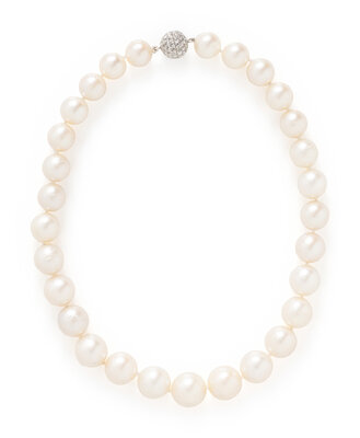 Graduated pearls measuring approximately 12.60 - 16.40 mm, with a rose cut diamond set clasp. 18 karat white gold. 17 3/4 inches long.