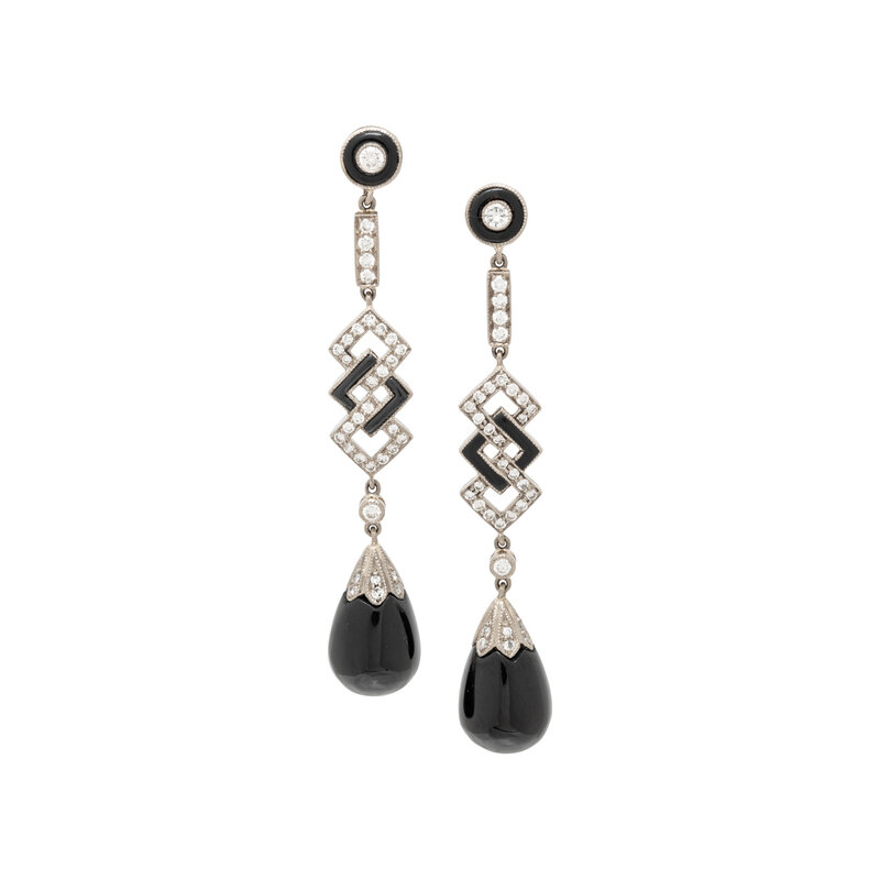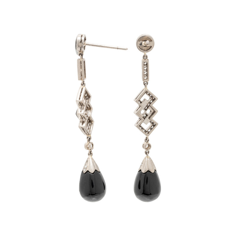 Onyx and round brilliant cut diamonds. Platinum. 2 inches long.