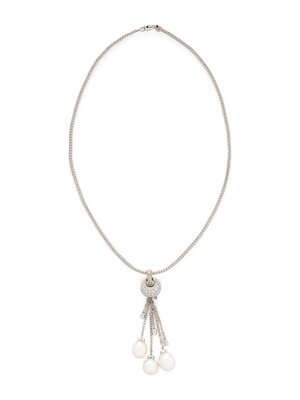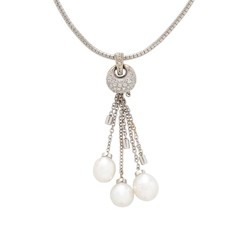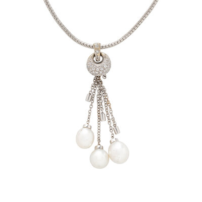 Cultured South Sea pearls measuring approximately 9.50 - 10.50 mm and round brilliant cut diamonds. White gold. Chain: 15 1/2 inches long. Pendant: 2 1/2 inches long.