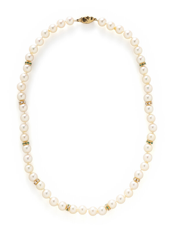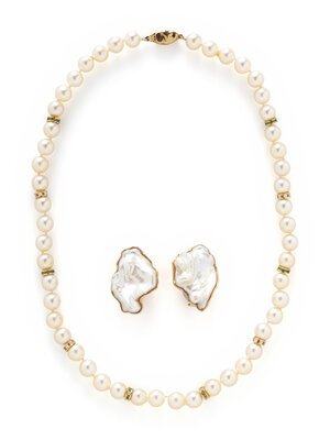 Including a pair of clip earrings set with baroque cultured pearls measuring approximately 30.75 x 19.00 mm and a necklace with cultured pearls measuring approximately 7.90 mm, with yellow gold spacers throughout set with round brilliant cut diamonds and round faceted emeralds. 14 karat yellow gold. Earrings: 1 1/4 inches long. Necklace: 18 inches long.