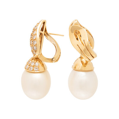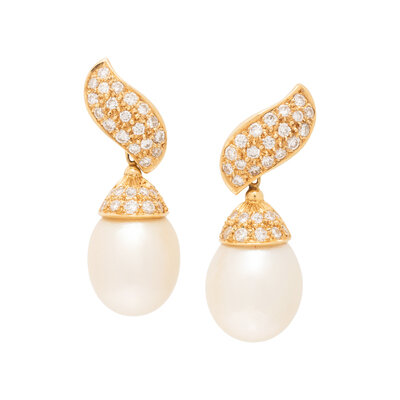 Cultured pearl drops measuring approximately 13.60 x 11.65 mm and round brilliant cut diamonds, on stud posts with clip backs. 18 karat yellow gold. 1 1/4 inches long.