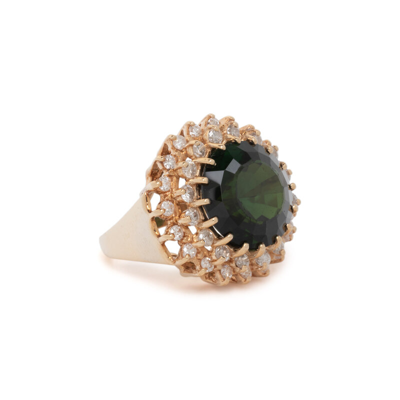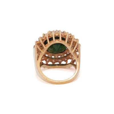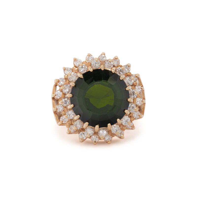 Round step cut tourmaline measuring approximately 14.25 x 14.35 x 9.30 mm and round brilliant cut diamonds weighing approximately 1.00 carat total. 14 karat yellow gold. Ring size 6 3/4.
