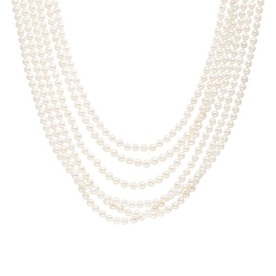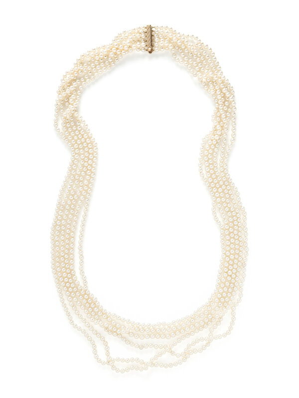 Six strands of cultured pearls measuring approximately 4.50 mm. Yellow gold. 32 1/2 inches long.