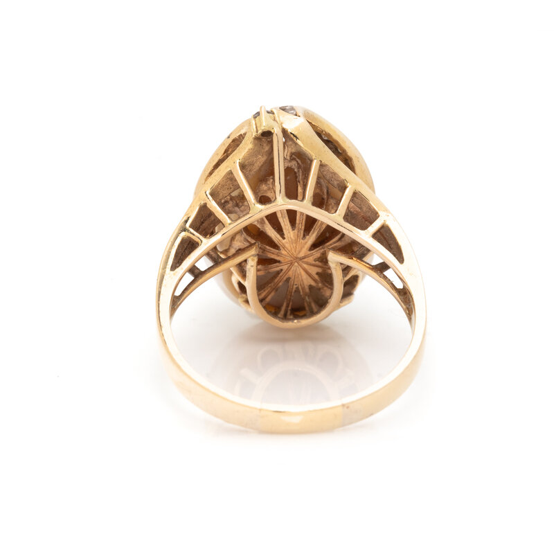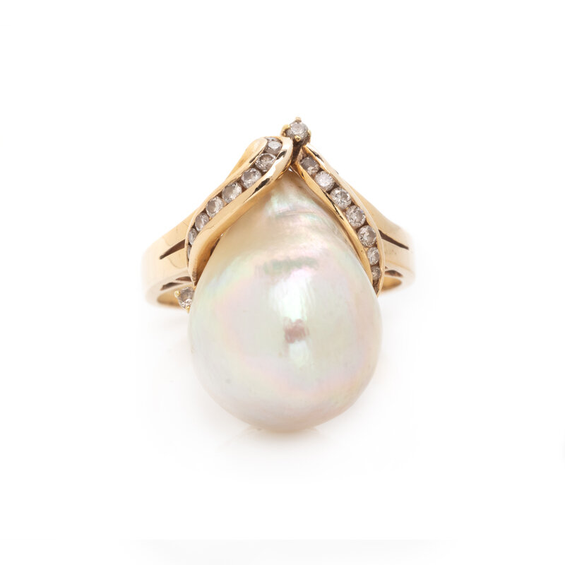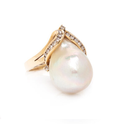 Baroque cultured pearl measuring approximately 20.00 x 15.00 mm and round brilliant cut diamonds. 18 karat yellow gold. Ring size 9 1/4.