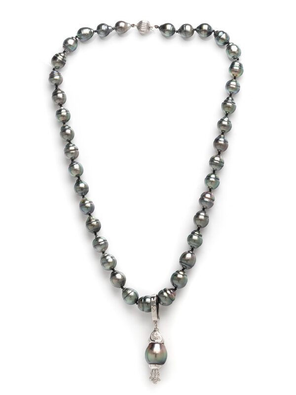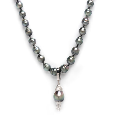 Cultured Tahitian pearls measuring approximately 8.30 - 9.80 mm, with an enhancer set with a cultured Tahitian pearl measuring approximately 13.16 x 13.75 mm and round brilliant cut diamonds. White gold. Necklace: 18 inches long. Enhancer: 2 1/8 inches long.
