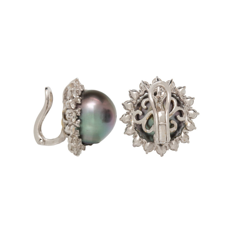 Baroque Tahitian cultured pearls measuring approximately 12.00 mm and round brilliant cut diamonds weighing approximately 2.00 carats total. Mounted in 18 karat white gold. 3/4 inch long.