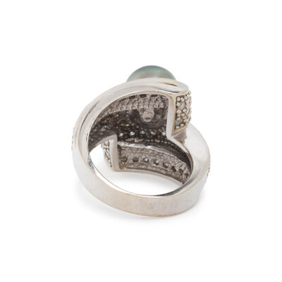 Tahitian cultured pearl measuring approximately 9.35 mm and round brilliant cut diamonds. 14 karat white gold. Ring size 6.